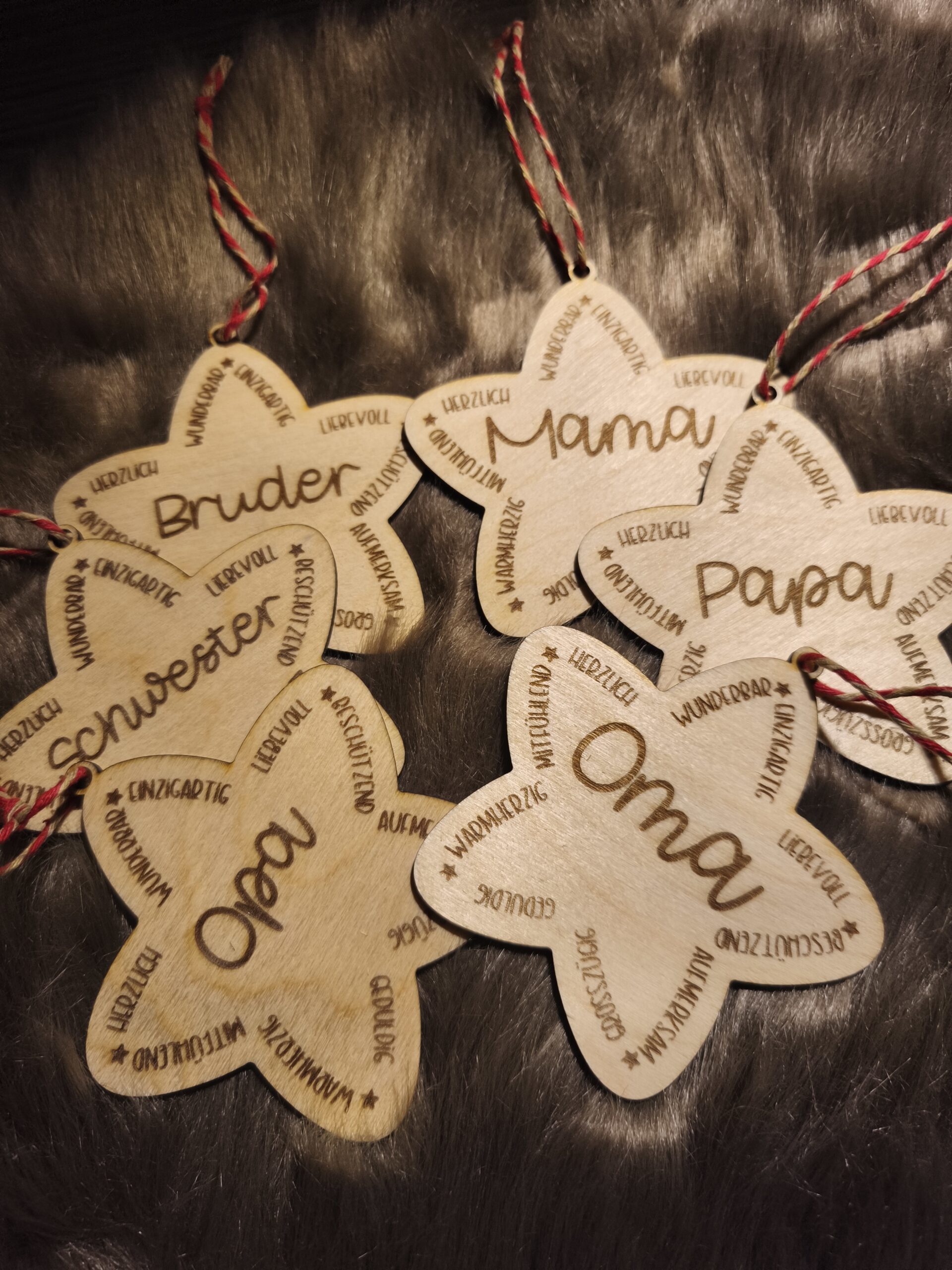 Weihnachten ist Familienzeit! Unsere liebevoll gefertigten Sternanhänger aus Holz mit Gravur für Oma, Opa, Mama, Papa, Bruder & Schwester bringen Wärme, Liebe und Zusammenhalt an deinen Baum.